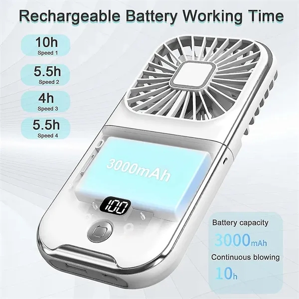 Description:Discover our newly upgraded portable fan with a digital display showing speed and battery status. This small fan offers four adjustable wind speeds to meet your needs, easily changed with a press of the power button. Equipped with a 3000mAh rechargeable battery and a 5V/1A USB output port, it doubles as a handy power bank for emergency phone charging. The hanging neck fan features a hidden mobile phone holder, allowing you to stay cool while working. With a working duration of 5.5-10 hours depending on speed, this fan is perfect for on-the-go use. Carry it in your pocket, bag, or wear it on a lanyard for easy travel.