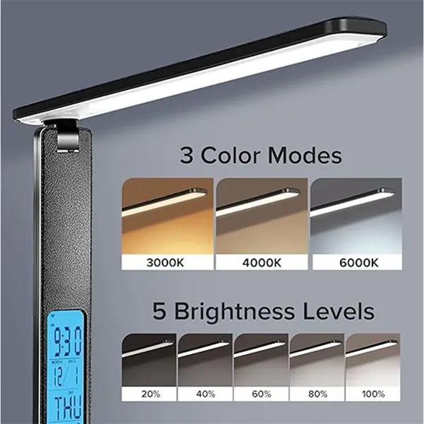 Description:Multifunctional LED Desk Lamp With USB Wireless Charging. The LED desk lamp combines powerful charging capabilities with multifunctional features, making it a versatile addition to any workspace. The lamp features an LCD screen with a digital clock, date, and temperature display, along with alarm and timer settings to keep your desk organized. Designed with eye care technology, it offers bright, eco-friendly LED lighting with an anti-glare shade and five adjustable brightness levels to reduce eye strain. The lamp also provides three color temperature modes-Warm White, Natural White, and Cold White-suitable for various activities like work, reading, or relaxation.