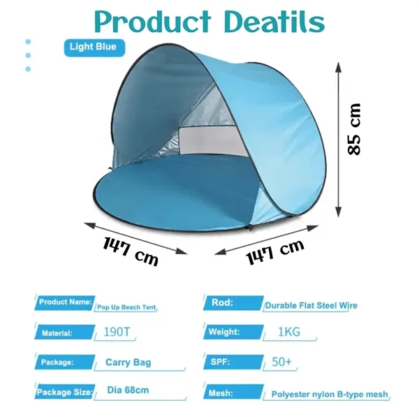 Description:Enjoy shade and shelter at the beach, park, lake, or even in your backyard with our portable pop-up beach tent! Made from durable polyester and comes in a vibrant blue color, it’s Ideal for the beach, garden, or traveling. Its waterproof fabric makes it perfect for outdoor activities. The tent features an automatic pop-up design, setting up in just one second and folding easily into a zippered carry bag for convenient transport. Lightweight and versatile, it’s great for hiking, traveling, fishing, and more.
