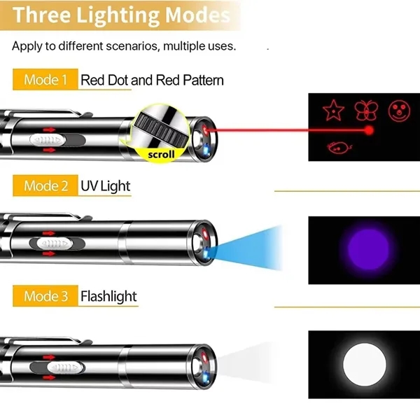Description:Boost your cat’s playtime with our versatile toy featuring 5 fun patterns: red dot, mice, butterfly, smiley face, and star. Switch between 3 modes—red light, purple light, and flashlight—using the front gear. The red light is great for PowerPoint presentations, while the flashlight mode provides illumination. Powered by USB, this toy eliminates the need for batteries. Its high-quality aluminum alloy shell and metal clip design ensure durability and portability. With three adjustment modes and a compact size, it’s perfect for interactive play and can easily fit in your pocket or bag for on-the-go fun.