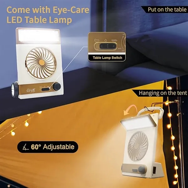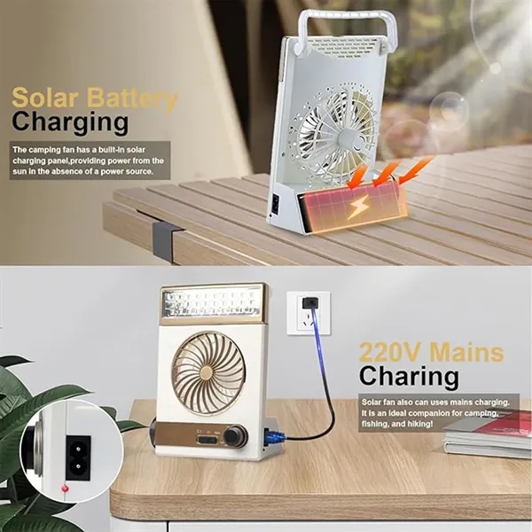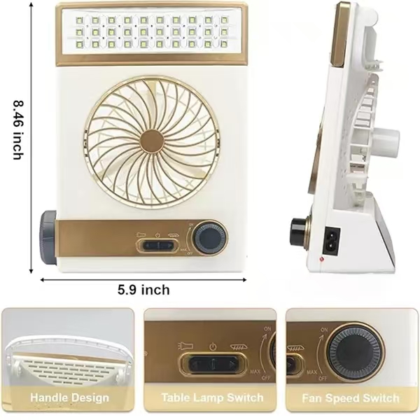 Description:This multifunctional device serves as a powerful fan, an eye-care LED table lamp, and a spotlight torch, making it highly versatile for various situations. With an ultra-quiet power motor, it ensures a peaceful environment while providing high wind speed and bright LED light. Ideal for outdoor activities such as camping, shading, or blackout emergencies, this solar light fan is perfect for temporary jobs or booths with limited power supply. The lamp’s plate cover allows easy angle adjustments, while the hidden portable design makes it convenient to carry and use. Adjustable brackets at the bottom let you control wind direction as needed. With dual charging options-hidden solar battery charging and mains charging, ensuring the device is always ready.