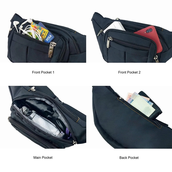 Description:Our fanny pack features four separate zipper pockets, perfect for organizing your essentials. The largest pocket can hold an umbrella or a 500ml water bottle, while the front pockets are ideal for an Phone, power bank, earphones, and keys. The back pocket offers a private space for banknotes and cards. Made from water-resistant 1000 Denier polyester with exquisite craftsmanship and clean seams, this fanny pack is splash-proof, but not waterproof. It includes tough, heavy-duty zippers that are sturdy and smooth, and a comfortable nylon waist belt, making it perfect for hiking and everyday use.