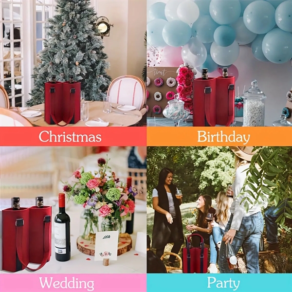 Description:Protect your wine from dust and add a touch of elegance to blind tastings, parties, weddings, and festivals. with our Reusable Two Bottle Wine Carrier! Crafted from high-quality PU leather and designed to fit two 750ml wine bottles, its perfect for gifts, home storage, and packaging glass bottles for parties, weddings, and festivals. The special handle design ensures convenient carrying and transport, while the ventilated, lightweight hollow design adds to its practicality. The folding feature saves space, making it ideal for various occasions.