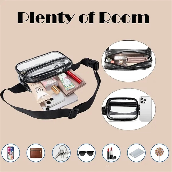 Description:Stay compliant and stylish at your next concert with our stadium-approved clear bag! Measuring 7.8 x 2.4 x 6.1, it meets all transparent bag policies, making it perfect for concerts and stadium sports events. Featuring two compartments, the main compartment holds essentials like your phone and wallet, while the widened front pocket provides easy access to items and fits a 6.7 phone and keys securely. Made from high-quality, waterproof 0.5 mm PVC material, it keeps your belongings dry and odor-free. The strong, sturdy zipper ensures durability. The adjustable waistband extends up to 54, allowing you to wear it as a belt bag or crossbody bag, offering versatility and retro style.