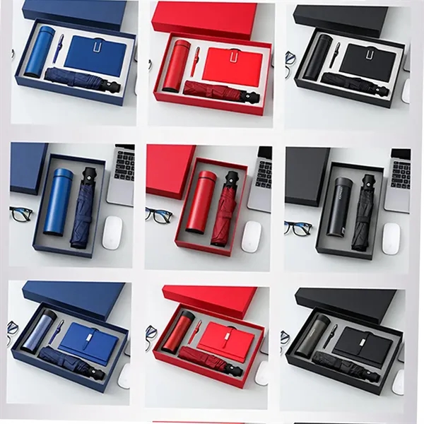 Description:This Business Gift Box Set is a perfect blend of style and practicality, ideal for professionals and corporate gifting. The set includes a smart thermos, a business umbrella, a notebook, a signature pen, and a gift box handbag. The smart thermos has a capacity of 500ml and is made of 304 stainless steel with an intelligent temperature display, ensuring your beverage is always at the perfect temperature. The business umbrella is a sturdy 8-bone automatic model with a rubber handle for a secure grip, perfect for unexpected weather. The notebook features a PU leather cover and high-quality ivory paper, offering a premium writing experience. The metal signature pen is crafted with precision, and the elegant gift box and handbag provide a refined presentation.
