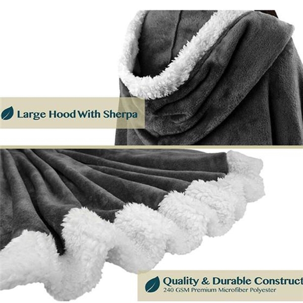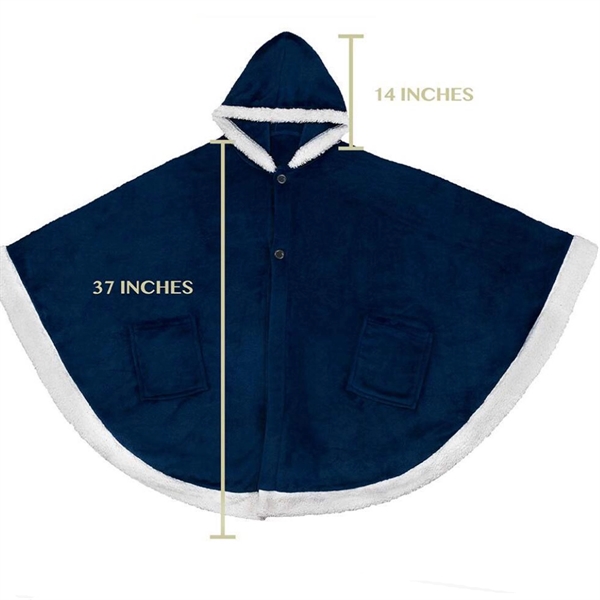 Description:Perfect to lounge and relax around home, on sofa/coach, watch TV, nap, or read. Roomy and easy to wear, just slip over your head like a poncho. Adjustable fit with button neck and sleeves. Comes with 2 pockets for cell phones, remotes, and essentials. Made from soft 240 GSM microfiber polyester and plush sherpa trim. Fleece poncho shawl is designed to keep your hands free and mobile while staying warm and comfortable. Your logo is welcome.