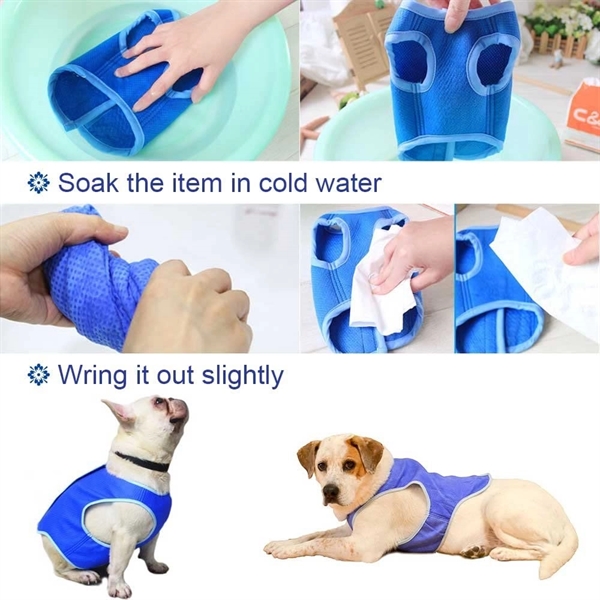 Description:Chill out a hot dog in the heat of summer with this pet vest with water-activated cooling action! Made of highly absorbent PVA with nylon patches and a pair of arm holes that fit all kinds of pets in sizes from extra small to large. Please refer to the sizing chart for more information. To use, simply wet the vest — the natural evaporation process keeps your dog cool and comfortable. What a great gift from a dog park, pet groomer, veterinary office or pet supply retailer. Available in blue. Add your school, sports team, organizational or company logo or message to customize.