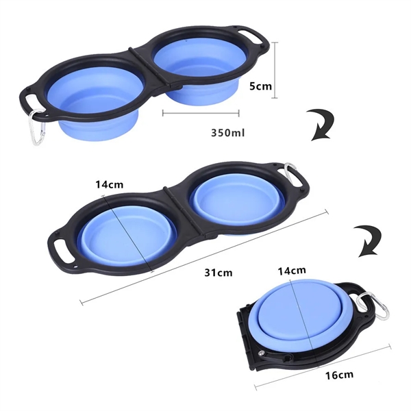 Description:Collapsible dog bowls, feed your pets with food & water at the same time. Fold up the double bowls together, portable and more compact, save your space when travelling, walking with your dogs. Double bowl design works as a full meal with food and water, or feeding 2 pet friends at the same time. Not only suitable for food and water, but our collapsible dog bowl can also be used as a feeding or drinking station for small pets like cats and rabbits. It’s a versatile accessory for pet owners. This pet bowl is a perfect travel gadget for your dog or cat. Comes with Bonus extra durable carabiner, convenient be attached to dog leash, backpack, belt loop perfect for Outdoors Walking, Hiking, Camping, Travelling.
