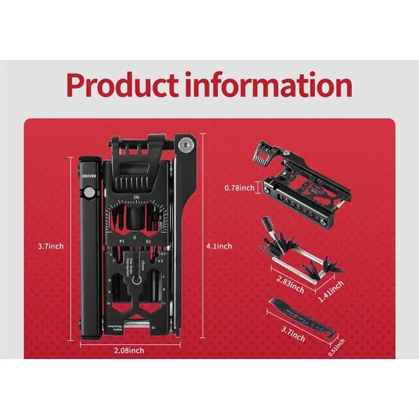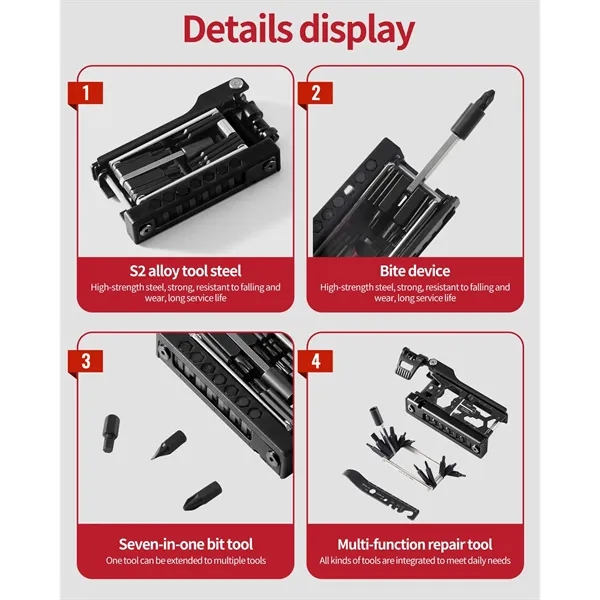 Description:38-in-1 Detachable Multifunctional Bicycle Tool Set. This multifunctional bicycle repair kit includes 38 compact professional tools, designed to tackle common issues like chain and tire failures during outdoor rides. The kit supports repairs in challenging conditions, ensuring safe continuation of your cycling journey. It features essential tools such as a chain remover, tire lifter, various plum and hex wrenches, flat and Phillips screwdrivers, and a bottle opener-providing all you need for outdoor repairs. Its compact, travel-friendly design fits easily in a saddle bag or pocket. Made from durable S2 alloy tool steel, it’s wear-resistant and corrosion-resistant, perfect for outdoor, home, and bike repair needs.