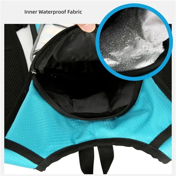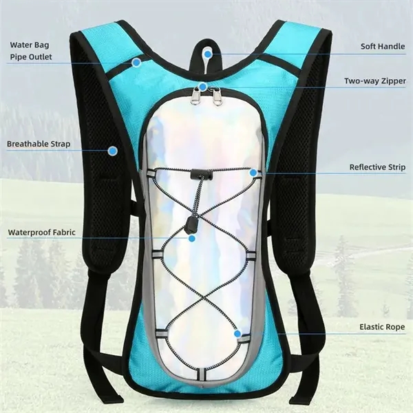 Description:Super lightweight 8.5 oz hydration pack backpack with 2L water bladder. Waterproof and tear-resistant fabric, PU coated nylon hydration pack bears 25 lbs. Water backpack for hiking with 2L bladder, BPA-free, food-grade PEVA material, and hose clamp. Leakproof bite value, water flows fast and never drips on when locked. Multi-adjustable shoulder straps on hydration Pack, can be adjusted. Hydration packs are suitable for adults. Ergonomically fits for your shoulders, chest, and waist. Soft air mesh back speeds up the air flow and makes your back cool. Running backpack bidirectional main zipper pocket for a water bladder, small storage compartments on front, two small mesh pouches for umbrella, mineral water, BlueTooth stereo, two mesh pouches on the shoulder on phone, and keys.