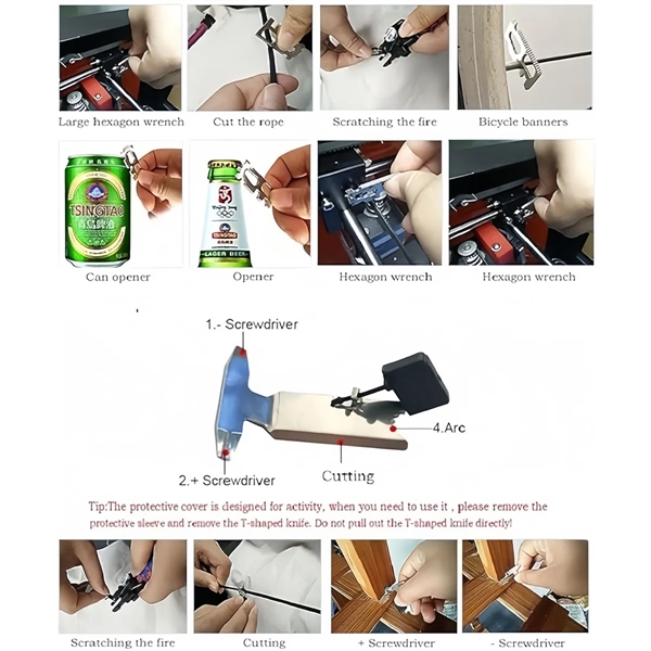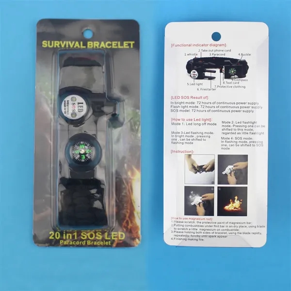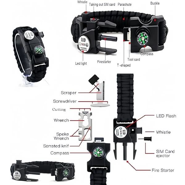Description:Never be caught unprepared! This multi-functional survival bracelet is equipped with an SOS LED light, compass, whistle, magnesium stick, T knife, tool card, adjustable fastener, SIM card pin, parachute cord, bike tools, wrench, bottle opener, can opener, screwdriver, scraper, and panner. Perfect for outdoor activities like climbing, camping, cycling, fishing, and hiking, it ensures you’re prepared for any adventure. Made of durable nylon and polyester, the bracelet can be unraveled into a 3.2-meter rope supporting up to 550 pounds. It’s ideal for stopping bleeding, creating traps, bundling tents, hanging hammocks, and more. Adjustable to fit most wrists, this high-end, professional unisex bracelet is both practical and stylish.