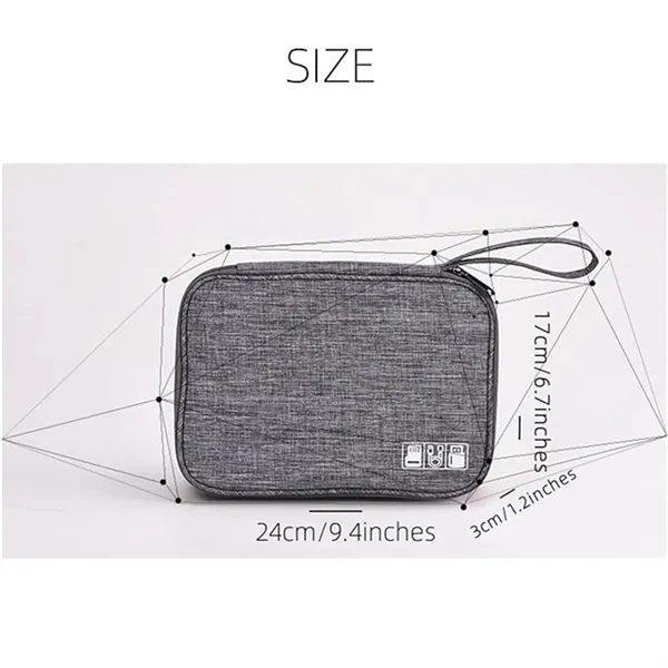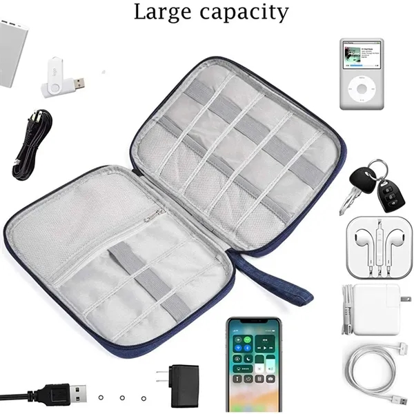 Description:The cable travel organizer bag is crafted from heavy-duty, durable, and waterproof Cationic 300D fabric, providing excellent protection for your gadgets. It features a well-padded, semi-flexible interior with mesh dust-proof pockets and detachable hook and loop dividers. The bag includes mesh pockets with zippers for portable hard drives, five mesh pouches with elastic loops for thumb drives and battery backups, and elastic loops for various cables and chargers. Designed for easy access, it comes with non-slip grips to keep gadgets secure. Perfect for both office use and travel, it keeps all your essential devices in one place, preventing wires from getting tangled and making it easy to find accessories quickly.