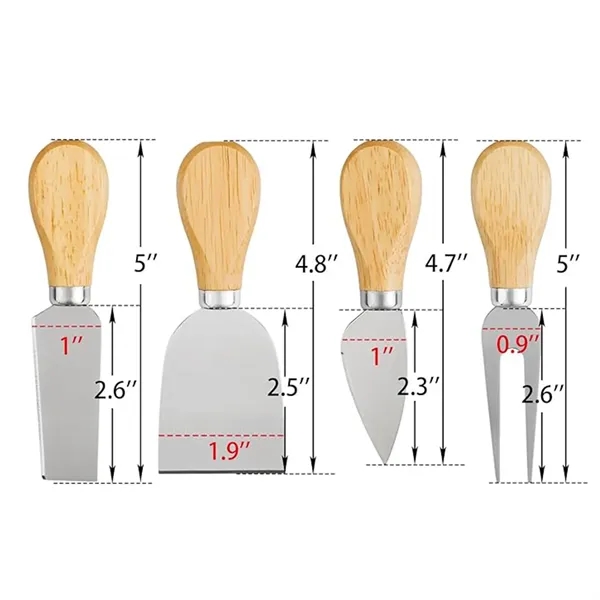 Description:This 4-piece cheese knife set is made of professional gauge stainless steel with wooden handles, perfect for any cheese lover. The set includes a mini spade knife for cutting hard cheese, a mini fork to chuck cheese, a narrow plane knife for slicing semi-hard and soft cheese, and a spreading knife for crumbly cheese. Each knife is designed for hard, soft, crumble, and fork cheese, making them versatile and stylish serving tools at parties. Lightweight yet sturdy, these knives are also great as gifts for weddings, bridal showers, housewarmings, birthdays, Christmas, and other holidays.There are also six-piece sets and gift boxes.
