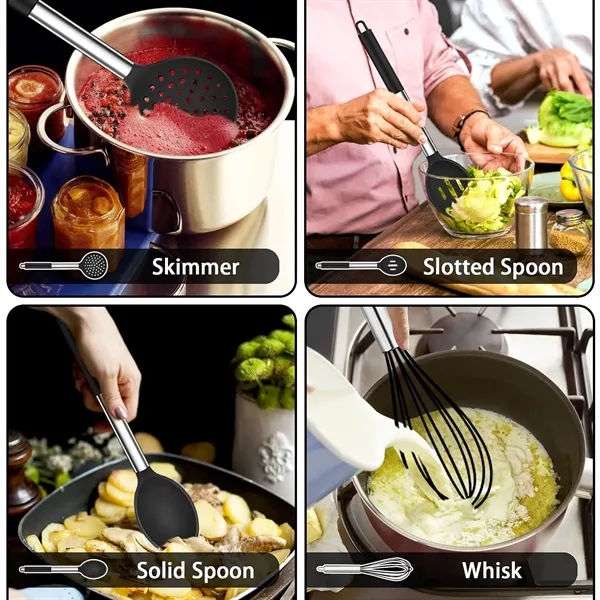 Description:Stainless Steel Silicone Handle Cookware 15-Piece Set. This 15-piece premium kitchen utensil set includes everything you need for culinary success: slotted turner, solid turner, deep soup ladle, pasta server, flexible spatula, and more. Made with high-quality 18/8 stainless steel handles and food-grade silicone heads, these utensils are designed for durability, heat resistance (up to 446F), and daily use without bending or rusting. The one-piece stainless steel core enhances strength, while the anti-scalding silicone handle sleeve provides comfort. Easy to clean, you can hand wash or toss them in the dishwasher. Enjoy a worry-free cooking experience with this versatile and reliable set!