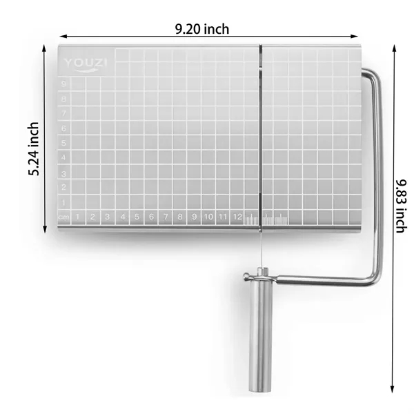 Description:Ham and Cheese Slicer with Scale. This cheese cutter is designed with a precise grid scale, making it easy to slice cheese into even portions. Its ergonomic design features a durable cast handle, perfect for cutting larger cheese blocks like mozzarella, Swiss, and Parmesan, as well as butter or handmade soap. Whether you want thin slices or thick cubes, this slicer allows for accurate cuts. Made from food-grade stainless steel, it’s easy to clean-just pop it in the dishwasher. With non-slip rubber feet for stability, it’s a must-have kitchen gadget for cheese lovers. Ideal for any cheese board or set!