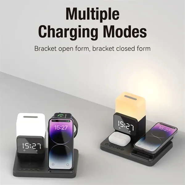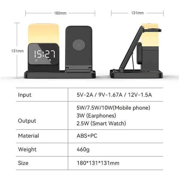 Description:This multifunctional wireless charger can charge your phone, headphone and watch at the same time. It also has clock, alarm clock and night light functions. You only need to have a 6 in 1 wireless charging station then you will say goodbye to messy wires, make the desktop will become very tidy. This charger is also equipped with an 15W fast charging adapter and cable to ensure the charging quality.This 6 in 1 night light charging station can be used as clock and alarm clock, and with an adjustable night light. Click the M key can calibrate the clock, the + or – key can make adding or subtracting numbers. Double-click the M key can set the alarm clock. Long pressing the M key can delete the alarm clock.