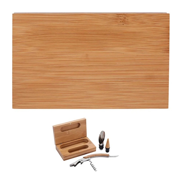 Description:Our wine set comes with a 2-function bar tool. Come packed in a stylish hinged bamboo box with closure. Celebrate your love for wine with our Bamboo Wine Accessory Set! The bamboo construction of this set makes it an attractive addition to your home bar or kitchen!