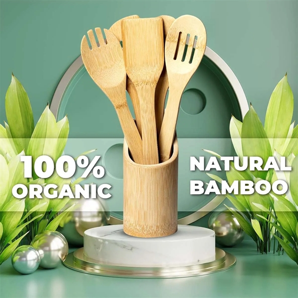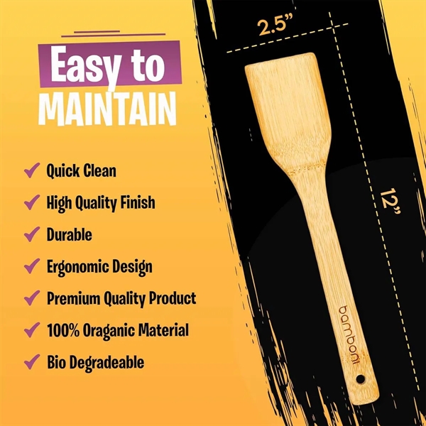 Description:Natural Bamboo Kitchen Utensil Set for Cooking.You need to get rid of all wooden cooking spoons painted or coated and yet claim to be natural. Bamboni 6 Pieces Bamboo cutlery set is wax-free, unpainted, and uncoated to preserve your food from unpleasant odors, BPA, and other toxic substances.Stir your favorite meal with these non-stick, heat resistant, easy to clean bamboo kitchen utensils.Go for the reusable bamboo cooking utensils set, beneficial for you and our planet.Our bamboo spoons for cooking are super lightweight to carry anywhere, anytime. So now take natural bamboo spatula on trips, camping, or traveling and cook delicious food with safety.It is a classy gift for those who love to showcase their art in the kitchen to cook and serve delicious food.