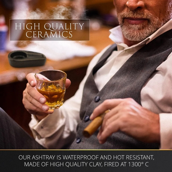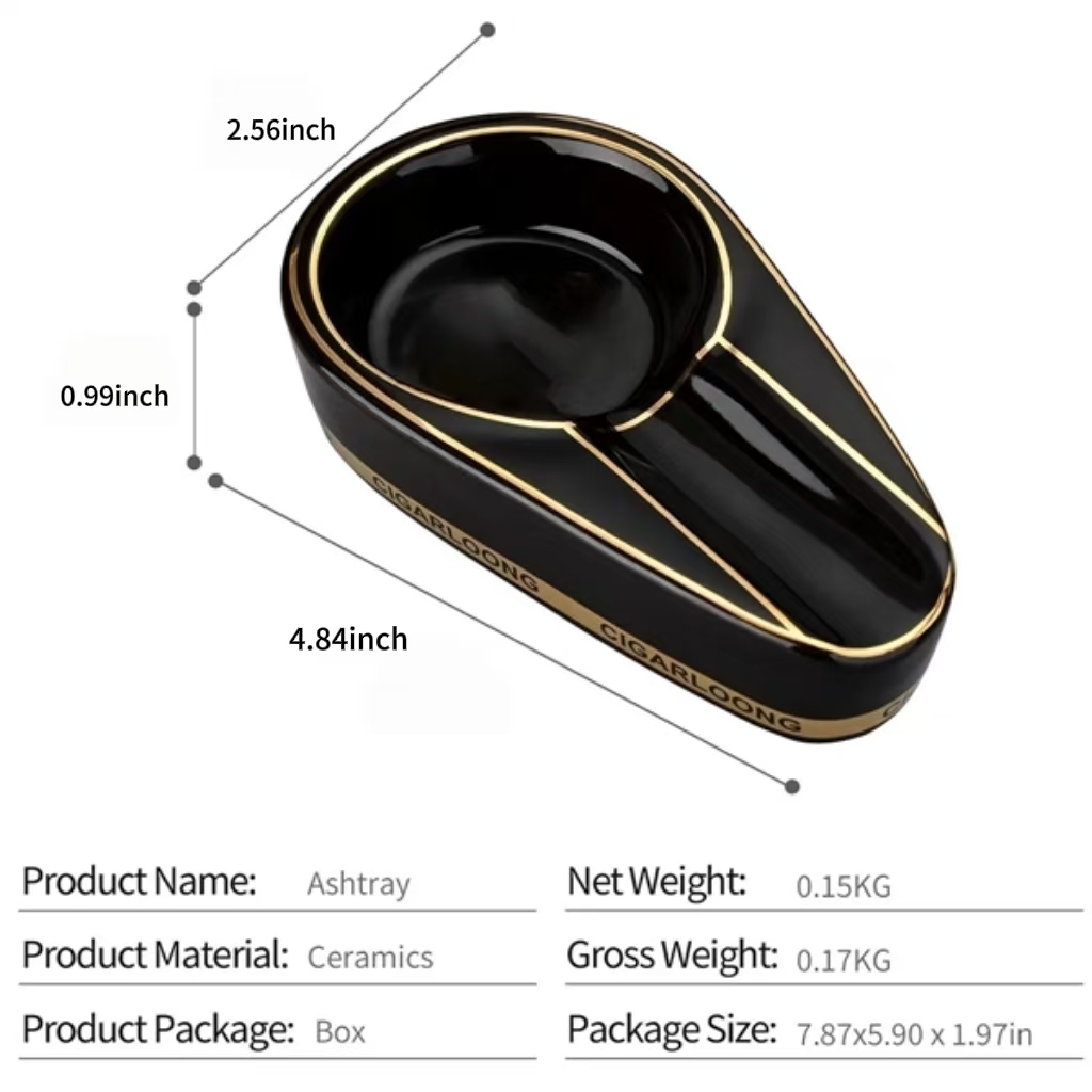 Description:The single-use design is perfect for an individual cigar. A beautiful black glossy finish coats the exterior, giving the ashtray a supreme sheen. The bottom of the ashtray is covered with a black protective felt pad which helps to prevent any scratches ending up on your furniture.Our ashtray is constructed out of real ceramic with a glossy black finish and gold decorative inlay. Cleaning is simple and easy, just wash it with soap and water.Lightweight and portable design is ideal for storage and cleaning. The ashtray will comfortably fit in any of our Case Elegance humidor drawers.
