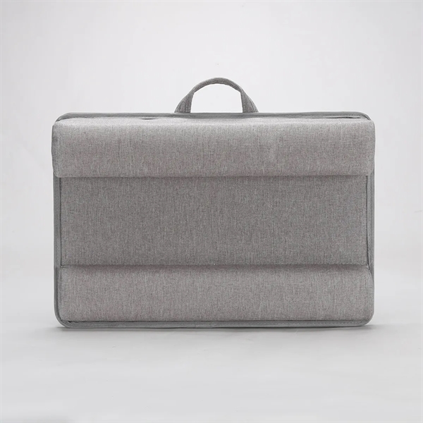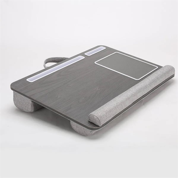 Description:This lap desk is built with an environmentally friendly engineered wood panel and dual cushions for comfort and support. Designed to be used as a laptop stand,work stand,reading desk,and table desk to work more comfortably while watching TV,sitting outside or on the road. The laptop desk features a tablet holder and phone holder so you can keep your devices in one place. It is big enough to fit a 17 inch laptop. The wrist pad provides a comfortable place for your wrists while also preventing the laptop from slipping off the desk. It is designed with a handle that makes it easy to carry. Take the lap desk with you to the coffee house,library,airport or office for an improved work experience. Your logo can be printed on this desk.