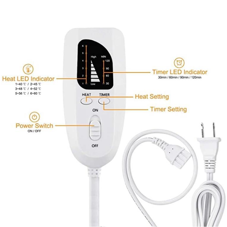Description:Comfortable Material: Quality flannel provides optimal comfort for touch while facilitating heat preservation, and is machine washable after removing controller and power cord, maintaining hygiene and softness all along. Fast Heating&Long Cord: The heating pad with 6 temperature levels to adjust(104℉-140℉).4 timer levels to adjust(30/60/90/120min.).Fast heating for instant relaxation.Around 2m/6.5ft cord,move around freely. IC Controller&Timer: ON/OFF push switch,IC controller with LED indication..Intelligent timer for safety even if you forget to turn heat pad off. Size: 12×16,12×24,16×30,soft structure to embrace different body areas like neck,back,abdomen,or legs snugly,and effectively relieves fatigue and stress with penetrating comfy heat(Do not use as a seat cushion).