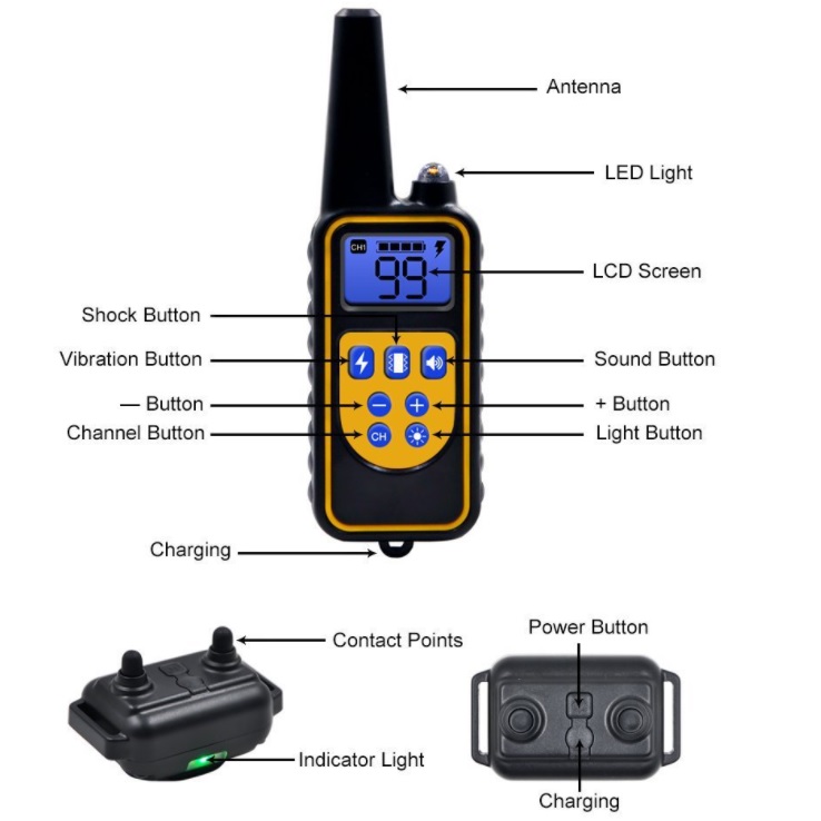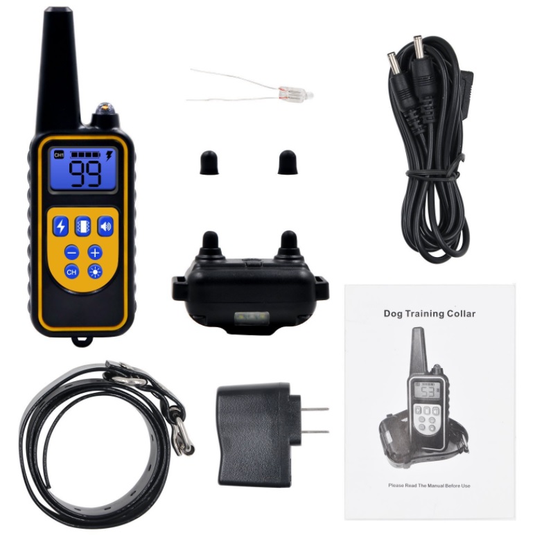 Description:Silicone material:soft does not damage the dog’s skin.Range: Up to 880 yards.Water Capabilities: IP67 waterproof.Tone/Vibration Options: 100 Levels of Vibration and 1 Level of Standard Tone.Shock Levels: 100 Levels of Static Shock.Battery Type: Rechargeable Lithium Batteries, charge at the same time.Easy to operate and ergonomic Transmitter.LCD Display for nighttime usage.Light Mode to assist seeing dog in low light conditions.for 1 dog Package Includes:1 x Receiver Collar,1 x Remote Transmitter,1 x Charging Cable,1 x Adapter,1 x Test Bulb,1 x Nylon Belts,2 x Contact Points,1 x User manual.Let this Dog training collar as your next promo.WELCOME TO INQUIRE.