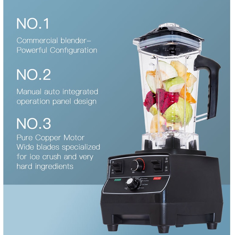 Description:Commercial blender-powerful configuration.Manual auto integrated operation panel design.Pure copper motor wide blades specialized for ice crush and very hard ingredients.Intelligent function operation panel,to make the taste as delicate as you like.Time control-preset time for smoothie soybean milk vegetable and fruit juice.Easy to make delicious ice-cold drink.Let this High quality professional commercial smoothie blender as your next promo.WELCOME TO INQUIRE.
