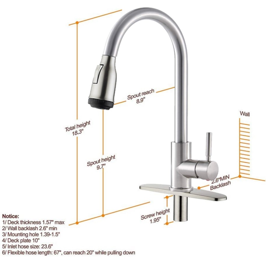Description:Simple lines create a contemporary style: With sleek look and innovative features, this pull-down kitchen faucet combines an elegant, versatile design with exceptional ergonomics and functionality. High-arch gooseneck spout and 360-degree rotation offer superior clearance for filling pots and cleaning. 4 Function Spray Mode for multiple uses: Stream, spray, and double blade, gas mode. Our kitchen sink faucets crafted with stain, rust and corrosion-resistant stainless steel, boast a smooth, stylish polished chrome finish. These Kitchen sink faucets passed more than 500,000 tests for resistance to drips and leakage and last twice as long as the industry standard.Eco-friendly and healthy faucet: Lead-free solid brass construction ensures a safer and healthier waterway.