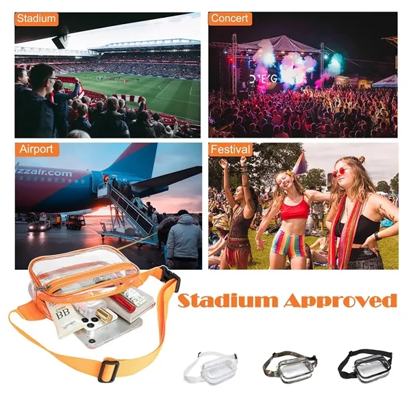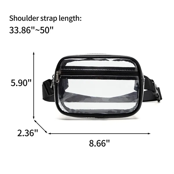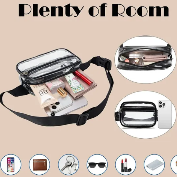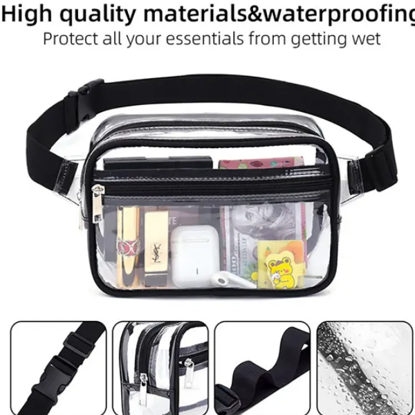 Description:Stay compliant and stylish at your next concert with our stadium-approved clear bag! Measuring 7.8 x 2.4 x 6.1, it meets all transparent bag policies, making it perfect for concerts and stadium sports events. Featuring two compartments, the main compartment holds essentials like your phone and wallet, while the widened front pocket provides easy access to items and fits a 6.7 phone and keys securely. Made from high-quality, waterproof 0.5 mm PVC material, it keeps your belongings dry and odor-free. The strong, sturdy zipper ensures durability. The adjustable waistband extends up to 54, allowing you to wear it as a belt bag or crossbody bag, offering versatility and retro style.