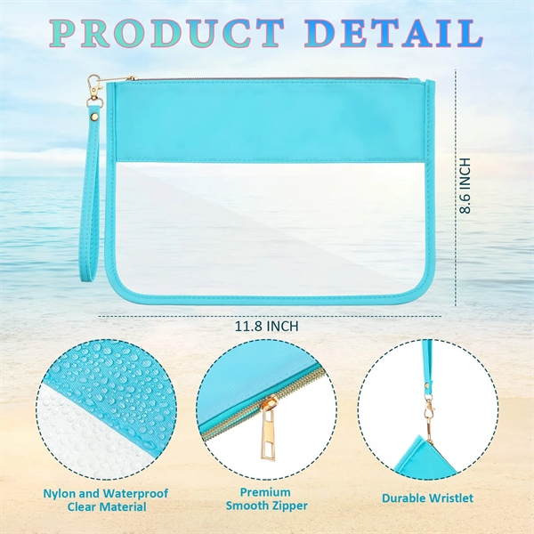 Description:Our vibrant clear makeup bags is perfect for keeping your make-up organized on-the-go. Customize them with chenille letters or embellishments to express your unique style through fun DIY designs. Made from quality PVC andOxford , these durable, easy-to-clean bags feature secure zippers and detachable wristbands for convenience. Measuring 11.81 x 8.66, they offer ample space for cosmetics, snacks, phones, wallets, and essentials, making organization effortless in any situation.