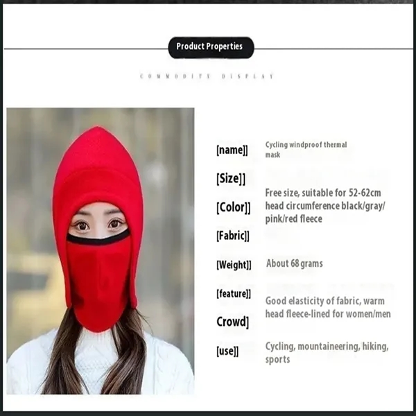 Description:Stay warm and comfortable with this 100% polyester soft fleece winter beanie. Designed with ear flaps and a built-in face mask, it offers versatile protection from the cold. The stretchy material fits most heads with a circumference of 56-59cm (22 to 23.23), making it ideal for both men and women. The face mask can be tucked inside the hat when not in use, adding extra warmth when needed. Perfect for outdoor winter activities like motorcycling, cycling, skiing, fishing, and hiking, this beanie is foldable, lightweight, and easy to pack, providing both warmth and convenience for all your cold-weather adventures.