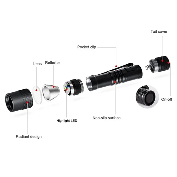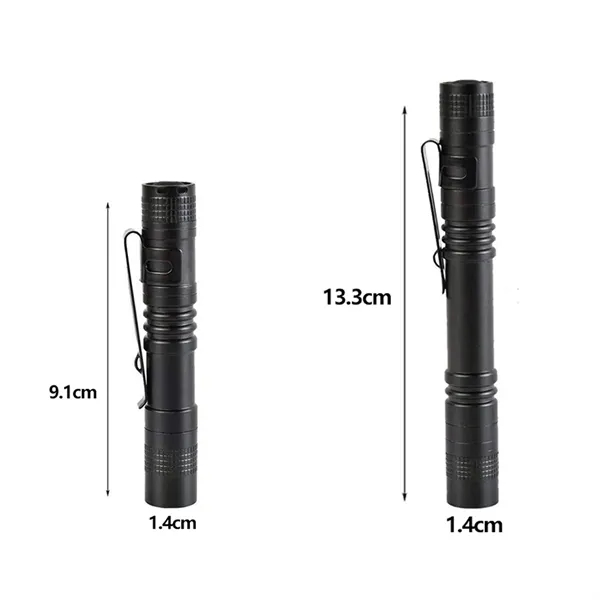 Description:The flashlight flood and focus can be adjusted freely, the head can be LED flashlight to stretch zoom.LED flashlight 100% brand new high quality aluminum alloy material, powered by 2 AAA batteries (not battery).Working light 3 of mode settings (high/low/strobe) and IP54 waterproof function.Lightweight and firm body with non-slip texture, can provide good grip for your palm.The pen-type mini flashlight is easy to carry daily, suitable for caving, camping, patrolling, teaching, hunting, hiking, searching, self-defense, night fishing, night riding.
