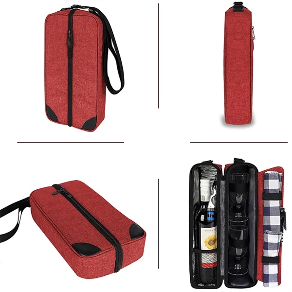 Description:Wine tote with cooler and picnic set carries cutlery, includes 2 plastic wine glasses, 1 steel corkscrew, 1 bottle stopper and 1 napkin, keeps two bottles or assorted cans cool for many days hours, please note that the wines in the photos are for display purposes only and are not included in this cooler, the bag comes with an adjustable shoulder strap for easy carry for ultimate portability, the material of this wine tote is nylon Oxford cloth, strong and durable.Making it perfect for outdoor picnics, beach trips, or romantic getaways. The durable nylon Oxford cloth promises longevity. This wine tote with cooler and picnic set is not just practical but also stylish, allowing you to enjoy your favorite beverages in any setting with ease. Customizable is available.