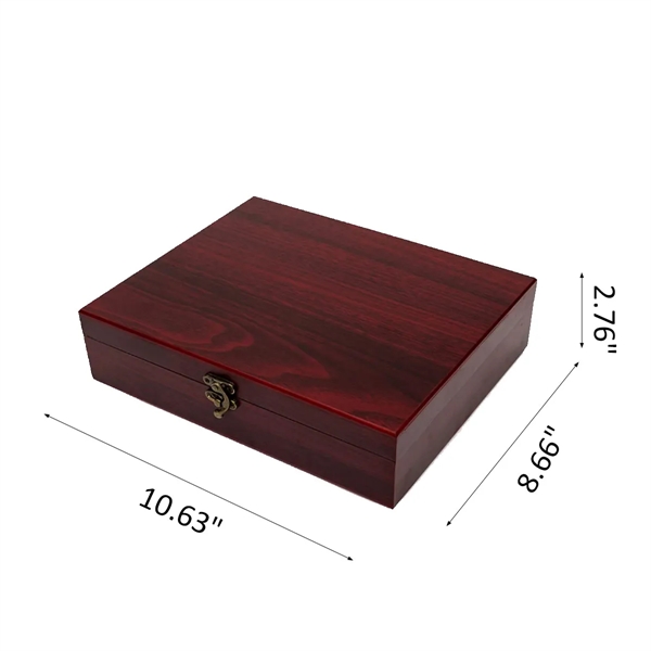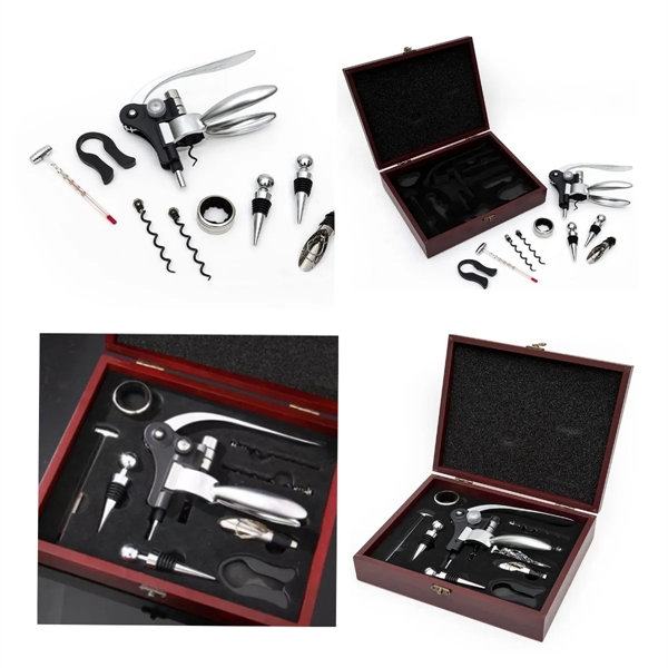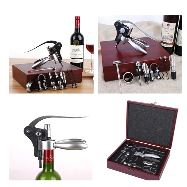 Description:This wine accessory kit is stylish, sleek and compact.The kit includes 9 tools, corkscrew, wine opener, anti-drip collar, wine pourer and more. The kit is ergonomically designed to minimize mess and enhance your wine drinking experience.The fittings are manufactured to universal standards to ensure that they work with most standard luxury wine and champagne bottles. The corked wine pourer is made from stainless steel and food grade silicone and the wine stopper is made from silicone seals and alloys. All tools are made from suitable materials to ensure corrosion resistance and safety. The package of the kit is made of mahogany grain wooden box, which is exquisite and beautiful, and the interior can well fix various accessories, which is very practical.Customized is available.In stock.