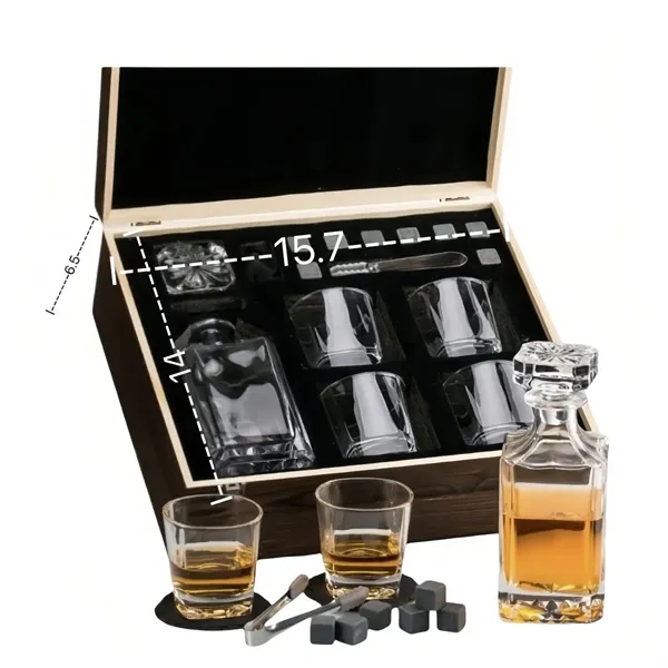 Description:This Premium Decanter Set Is The Ultimate Gift For Enthusiasts. It Includes A Luxurious Pinewood Gift Box That Can Be Custom-Engraved With Your Logo, Making It A Perfect Personalized Gift. Inside, You’Ll Find A Crystal Decanter And Two Matching Crystal Glasses That Exude Elegance And Sophistication. The Set Also Features Two Durable Stone Coasters, A Velvet Storage Bag For Safe Keeping, A Pair Of Stainless Steel Tongs, And Eight Reusable Stones To Keep Your Drink Perfectly Chilled Without Dilution. Ideal For Home Bars, Special Occasions, Or As A Thoughtful Gift For Him, This Set Combines Functionality With Timeless Style.