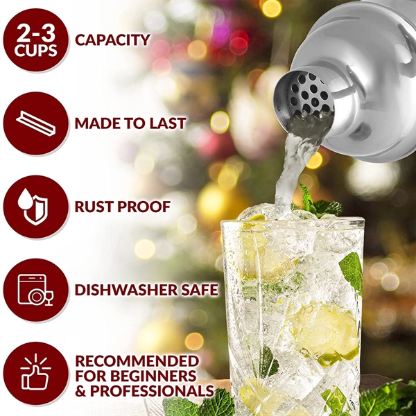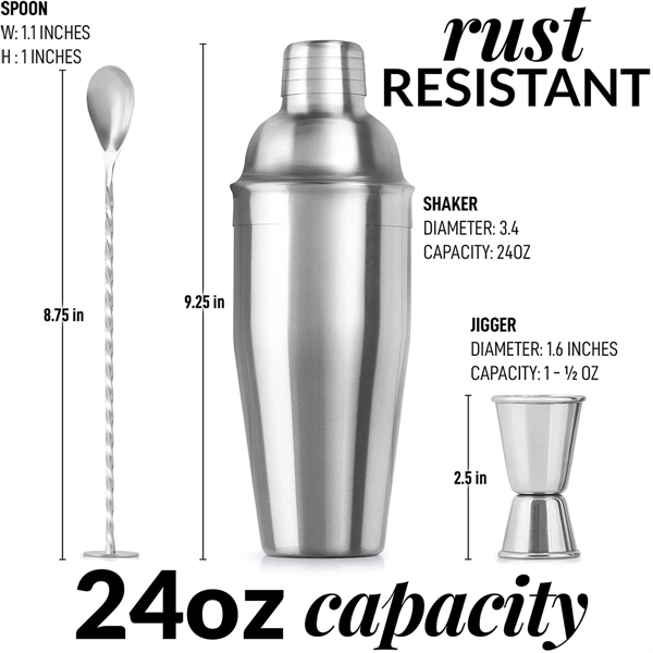 Description:The Cocktail shaker supplies include shaker cup, airtight lid, built-in strainer, two-sided measuring jigger (1.0 oz & 0.5 oz) and an elegant bar spoon with unique corkscrew design to aid in stirring and layering drinks. This Boston shaker-inspired bartending mixer will help you create the best cocktails.