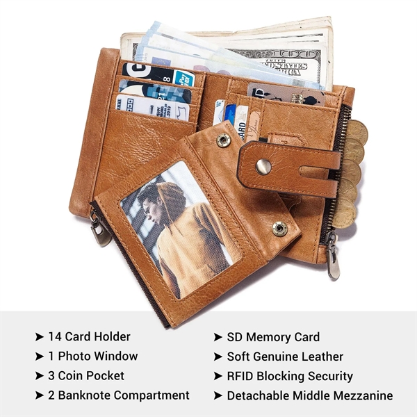 Description:The natural cowhide used does not deliberately polish, sand or modify the leather defects with heavy coatings. Enhanced Security with Chain — Equipped with an anti-theft chain, this wallet offers an extra layer of security to safeguard your valuables and provide peace of mind against potential theft or loss. Organized Storage — With 14 card slots, 3 zipper pockets, 2 cash pockets, 1 back card slot, 1 sim card slot, 1 SD card slot and1 ID window. It keeps your essentials neatly organized for easy access. RFID Blocking Protection — Safeguard your personal information and credit card details with the built-in RFID-blocking technology, protecting against unauthorized scanning.