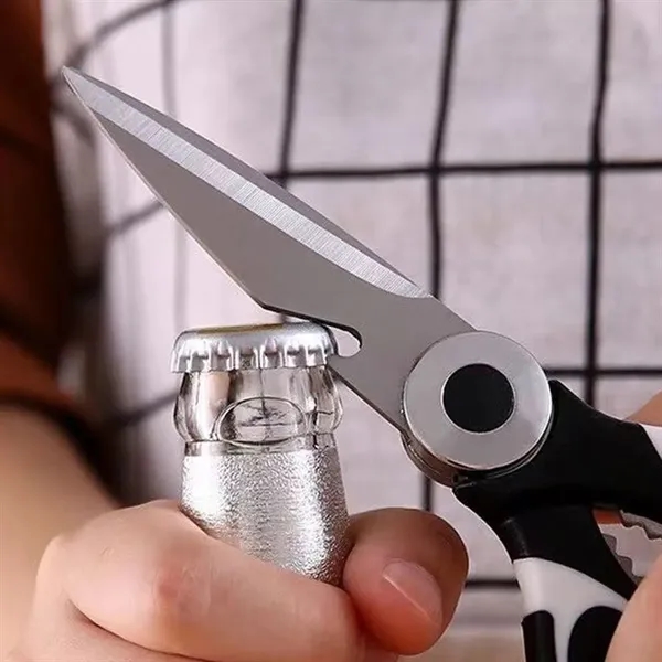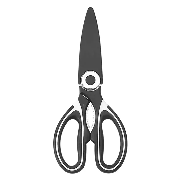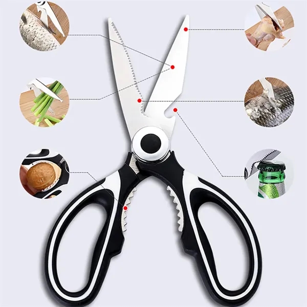 Description:Sharp as a knife blades feature advanced micro-serrated edge for slip proof cutting every time! Heavy duty multipurpose utility scissors for meat, poultry, seafood, and vegetables. You can easily cut chicken , duck, fish, crab, bacon, asparagus, herbs and small bones. Really good tool for prepare and cook ribs. Nice cutter for pizza and pasta. The plastic blade guard can protect the blades from damage and avoid hurting your hands.High quality hardened stainless steel blades can easily cut cardboard, twine, food, barbecue, food packaging, etc. Very suitable as food scissors, meat scissors, cooking scissors, kitchen scissors, cooking scissors, poultry scissors, practical scissors, meat scissors. Showcase your branding on the scissors and promote your brand.